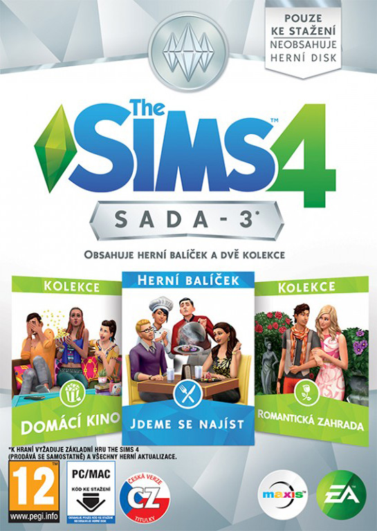The Sims 4 Sada 3 obsahuje jeden herní balíček (Jdeme se najíst), a dvě kolekce (Domácí kino, Romantická zahrada).