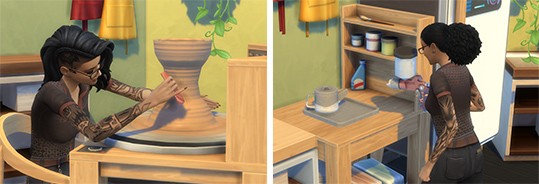 Část: 1 Hrnčířství je nová dovednost, do které se mohou Simíci pustit ve snaze o dosažení umělecké dokonalosti! Dětem můžete hrnčířství představit formováním hroud hlíny. Teenageři pak mohou začít vytvářet keramiku pomocí hrnčířského kruhu! Čím lepší Simíci v hrnčířství budou, tím více nových druhů keramiky budou moci vytvářet. Tuto keramiku budou moci používat nebo pomocí ní vyzdobit své bydlení! Když něco keramického vyrobíte, nezapomeňte to také glazovat ve vypalovací peci! Při glazování máte na výběr celou řadu pěkných možností, tak zvolte něco, co skutečně reprezentuje vaše Simíky! |